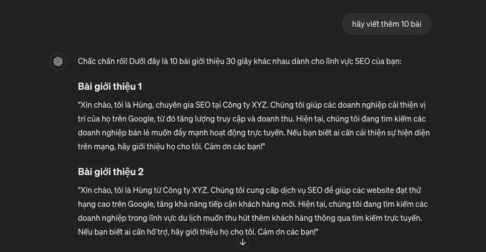 “Xin chào, tôi là Hùng, chuyên gia SEO tại Công ty XYZ. Bạn muốn website của mình bứt phá lên top Google nhanh chóng như một siêu xe? Chúng tôi biến ước mơ đó thành hiện thực! Nếu bạn biết ai cần trang web của họ đạt tốc độ ánh sáng trên Google, hãy giới thiệu họ cho tôi. Cảm ơn các bạn!”